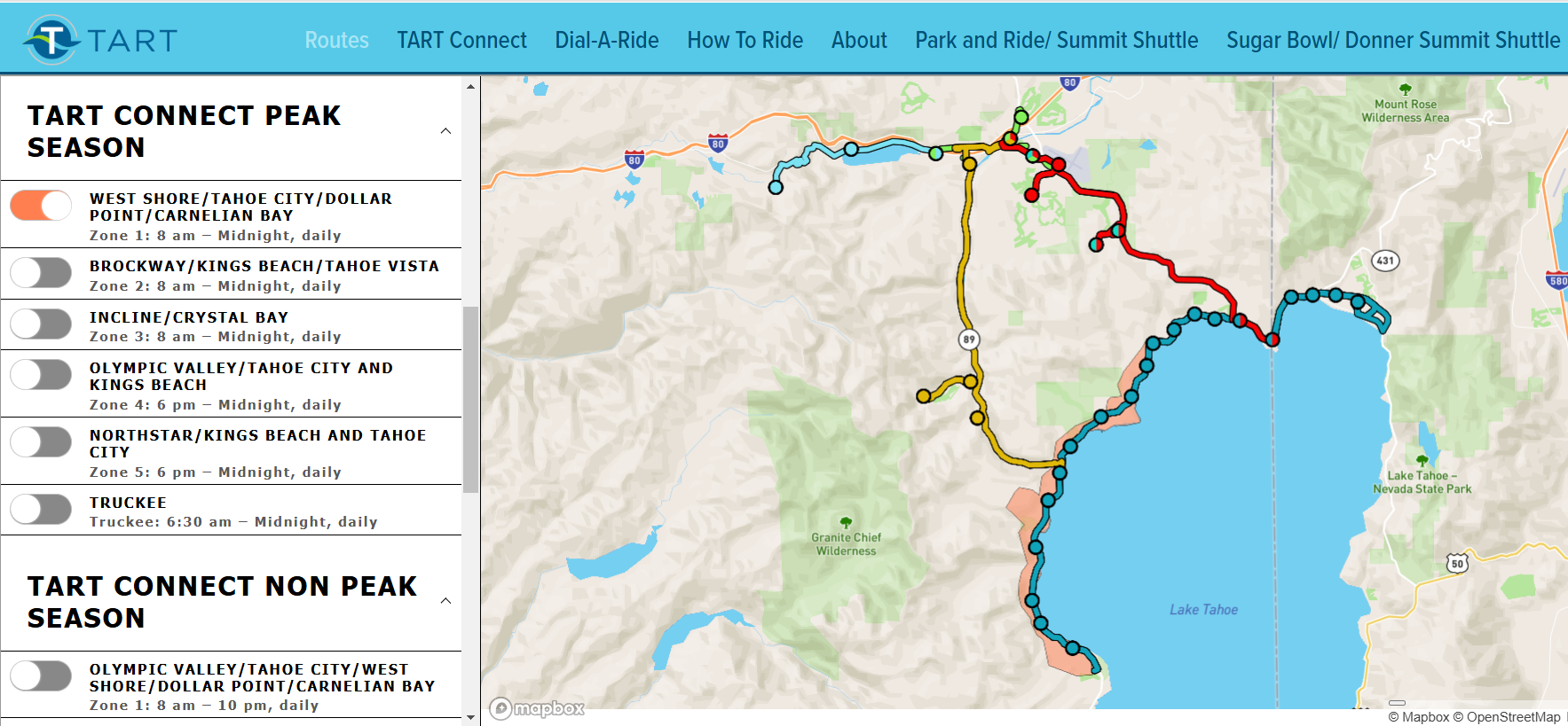 In 2020, Tahoe Truckee Area Transit (TART) requested additional features for their interactive map on their website. Due to staffing changes, the primary software developer for the interactive maps product was unavailable during the delivery window. I order to meet the agency’s timeline, I dug into the code of the interactive map product and generated easy-to-update code to display the agency’s dial-a-ride zones (of which there were many.) The code is still in use and visible on their map to this day.